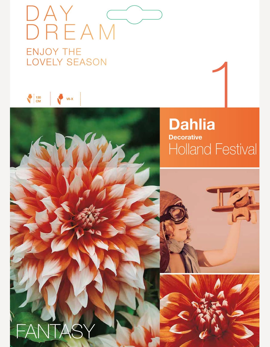 Daalia ‘Holland Festival’ on korkeakasvuinen koristekasvilajike, jolla on suuret oranssit kukat, joissa on valkoiset reunat ja joiden halkaisija voi olla 20-25 cm. Se kasvaa jopa 130 cm korkeaksi ja tarvitsee tukea. Se kukkii runsaasti heinäkuusta syksyyn, ja se on silmiinpistävä piirre reunustuksessa tai leikkokukkana.