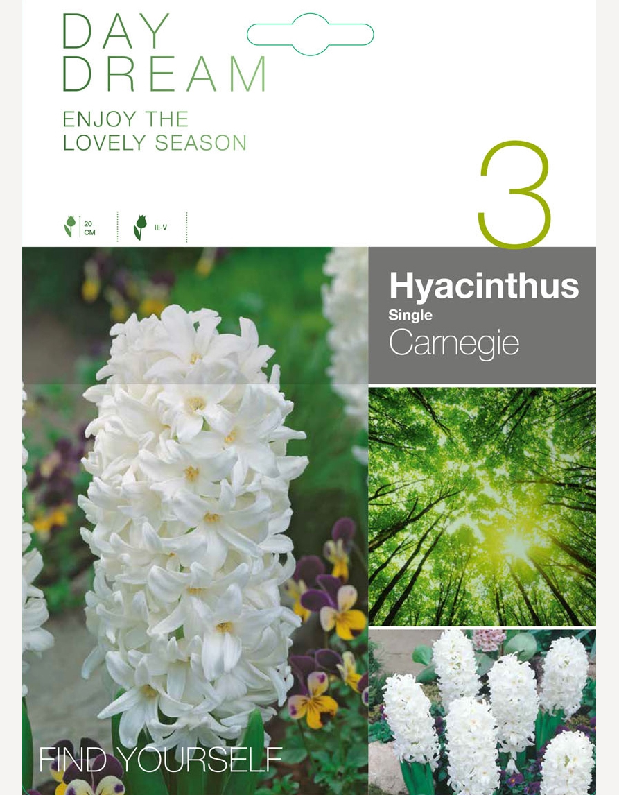 Hyasintti ‘Carnegie’ on klassisen kaunis valkoinen hyasintti, joka tuo puutarhaan puhtautta, raikkautta ja eleganssia. Sen tiheät, lumivalkoiset kukinnot valaisevat kevätistutuksia ja sopivat erinomaisesti niin yksin kuin muiden kevätkukkien rinnalle. Valkoinen sävy on ajaton ja helppo yhdistää sekä pehmeisiin pastellisävyihin että voimakkaampiin väreihin.