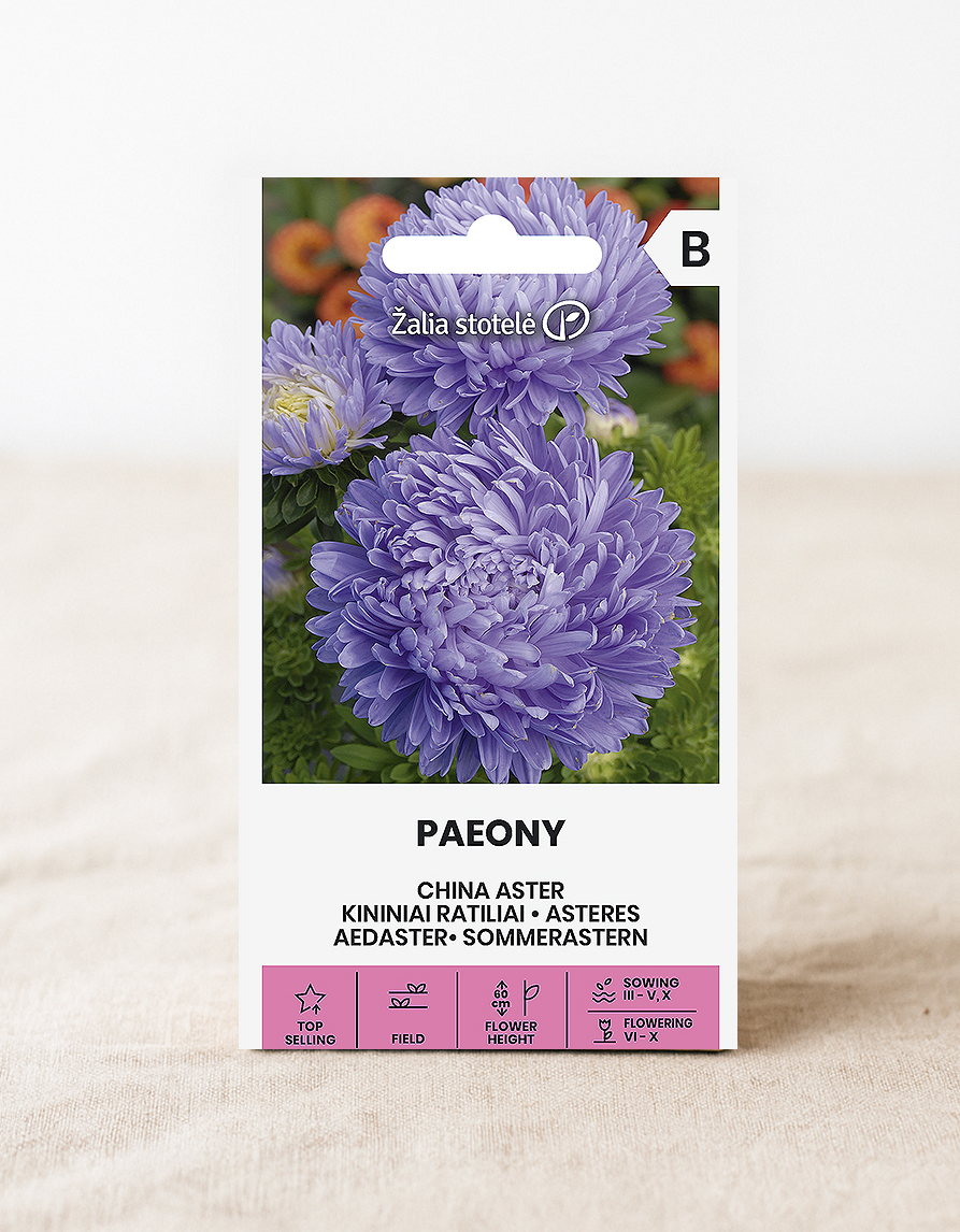 ‘Paeony’ kukkiva kiinalainen aedaster on kesäinen yksivuotinen kasvi, jolla on näyttäviä suuria kukkia, joka kasvaa noin 60 cm korkeaksi ja muodostaa hyvin haaroittuneen kasvin. Kukat ovat reheviä, täyteläisiä ja kauniin purppuran sävyisiä, joten se sopii erinomaisesti kukkapenkkiin tai leikkokukaksi.