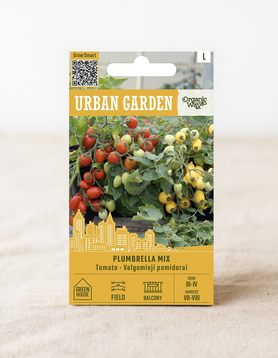 ‘Plumbrella Mix’ on sekoitus varhaisia ja tuottavia kääpiökirsikkatomaatteja, jotka sopivat erinomaisesti parvekkeelle, terassille ja ruukkuun. Kasvit ovat kompakteja eivätkä tarvitse tukea tai leikkausta, joten niitä on helppo kasvattaa pienissä tiloissa ja aloittelijoille.