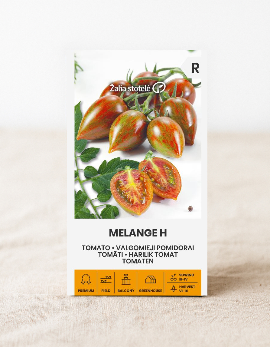 'Melange H' on erittäin aikainen ja taudinkestävä kirsikkatomaattihybridi, joka tuottaa pitkän sadon. Kasvit ovat korkeita, joten ne tarvitsevat tukea. Hedelmät ovat pieniä, 25-40 g painavia, ohutkuorisia, ja kypsinä ne ovat kauniita tummanpunaisia, joissa on vihreitä raitoja. Maku on miellyttävän makea ja aromi runsas.