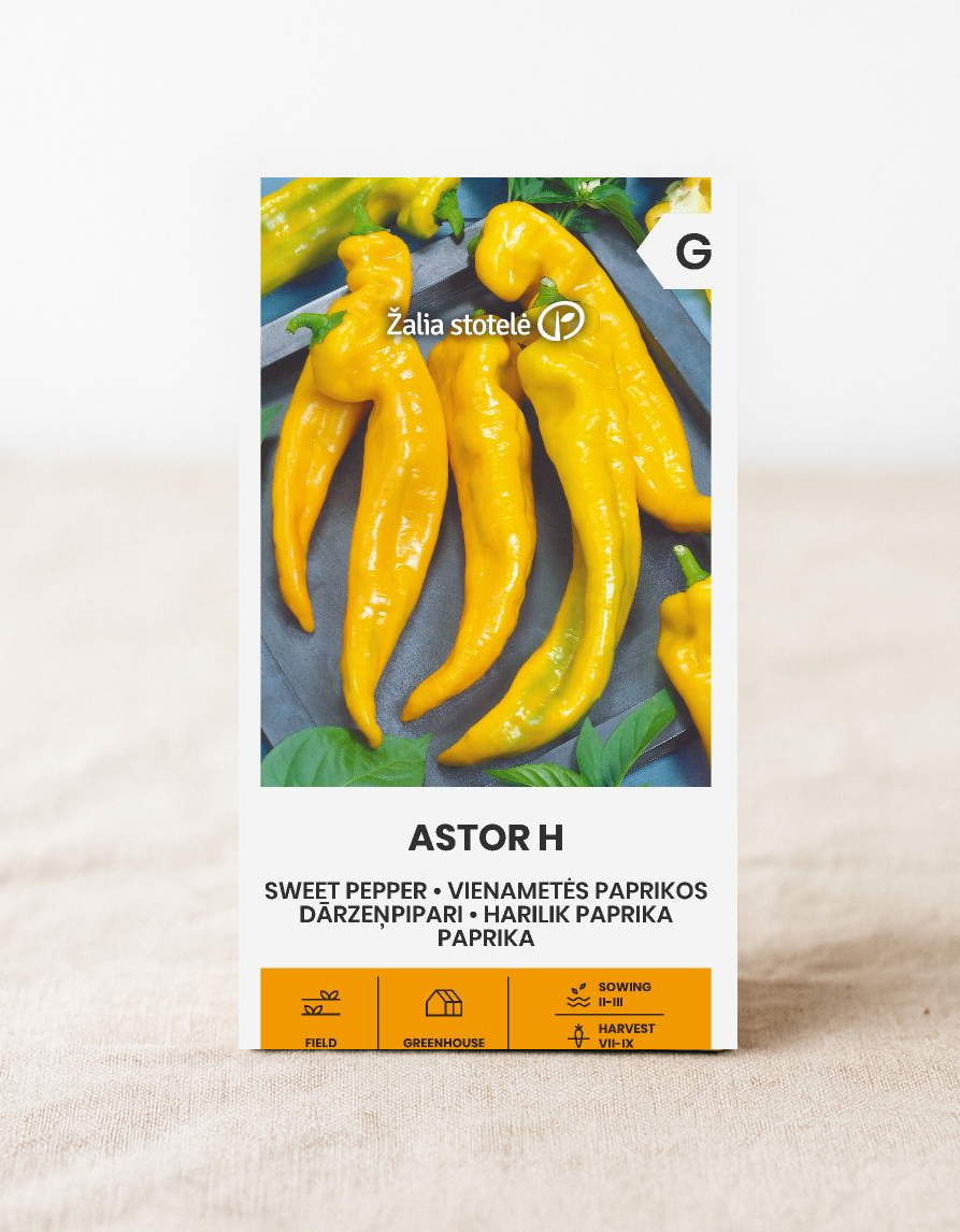 ‘Astor F1’ on aikainen ja korkeakasvuinen paprikahybridi, joka tuottaa pitkiä, kiiltäviä hedelmiä. Paprikat kypsyvät keltaisiksi, ovat noin 25 cm pitkiä ja painavat 200-210 g - vaikuttavan kokoisia ja erittäin hyvän makuisia. Soveltuu sekä kasvihuone- että avomaaviljelyyn.