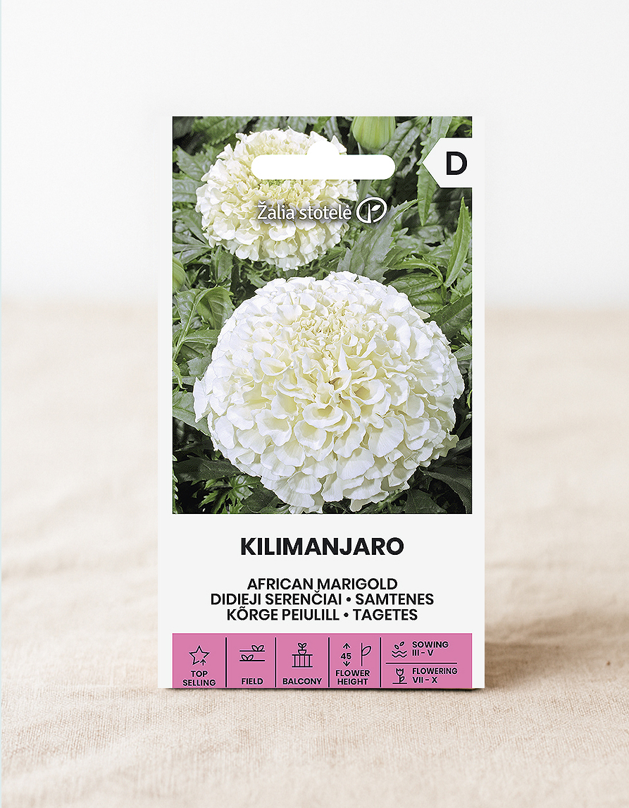 ‘Kilimanjaro’ on yksivuotinen kesäkukka, jonka tyylikkäät kukat ovat halkaisijaltaan jopa 8 cm. Sillä on kompakti kasvutapa (~45 cm), ja se sopii hyvin rajaan, terassille ja ruukkukasviksi. Se kukkii runsaasti heinäkuusta pakkasiin ja sopii erinomaisesti hautausmaalle. Nuutuneiden kukkien poistaminen pidentää kukinta-aikaa.