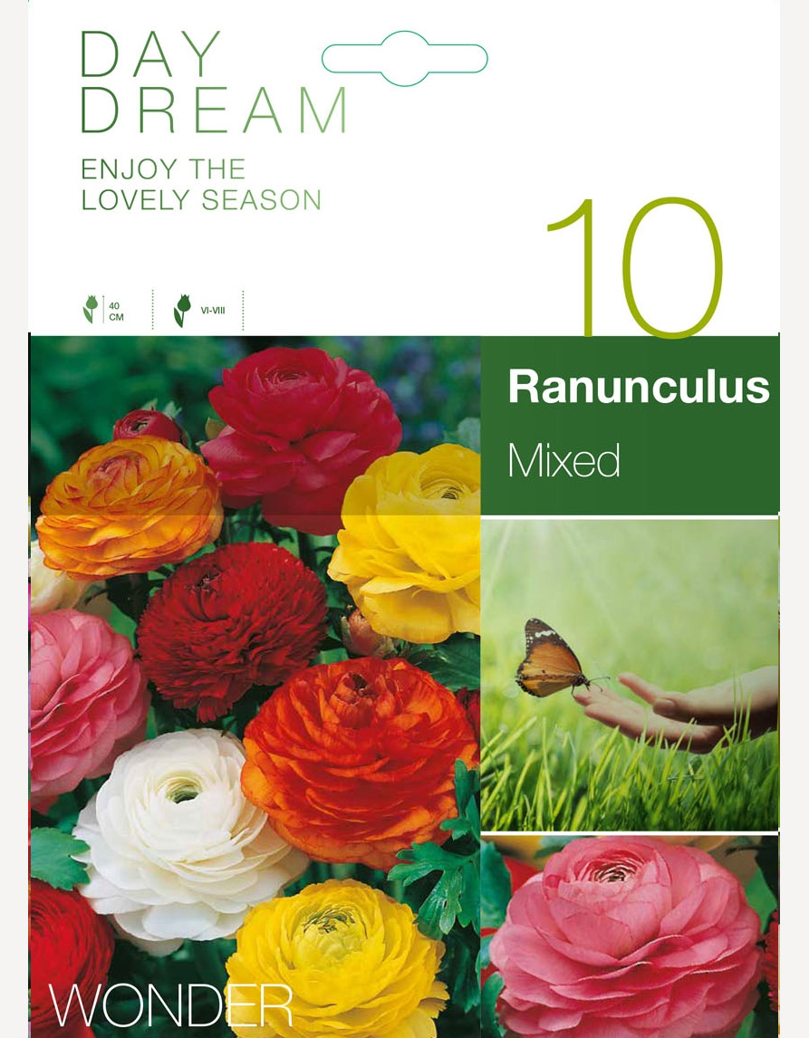 Lumoavan kauniit puutarhasipulit (Ranunculus asiaticus), joiden ruusun kaltaiset kukat tuovat ylellisen väriloiston kukkapenkkiin ja terassille. Sekoitus sisältää keltaisen, vaaleanpunaisen, punaisen, valkoisen ja oranssin sävyjä, jotka sopivat täydellisesti kukkapenkkiin, ruukkuihin ja leikkokukkiin.
