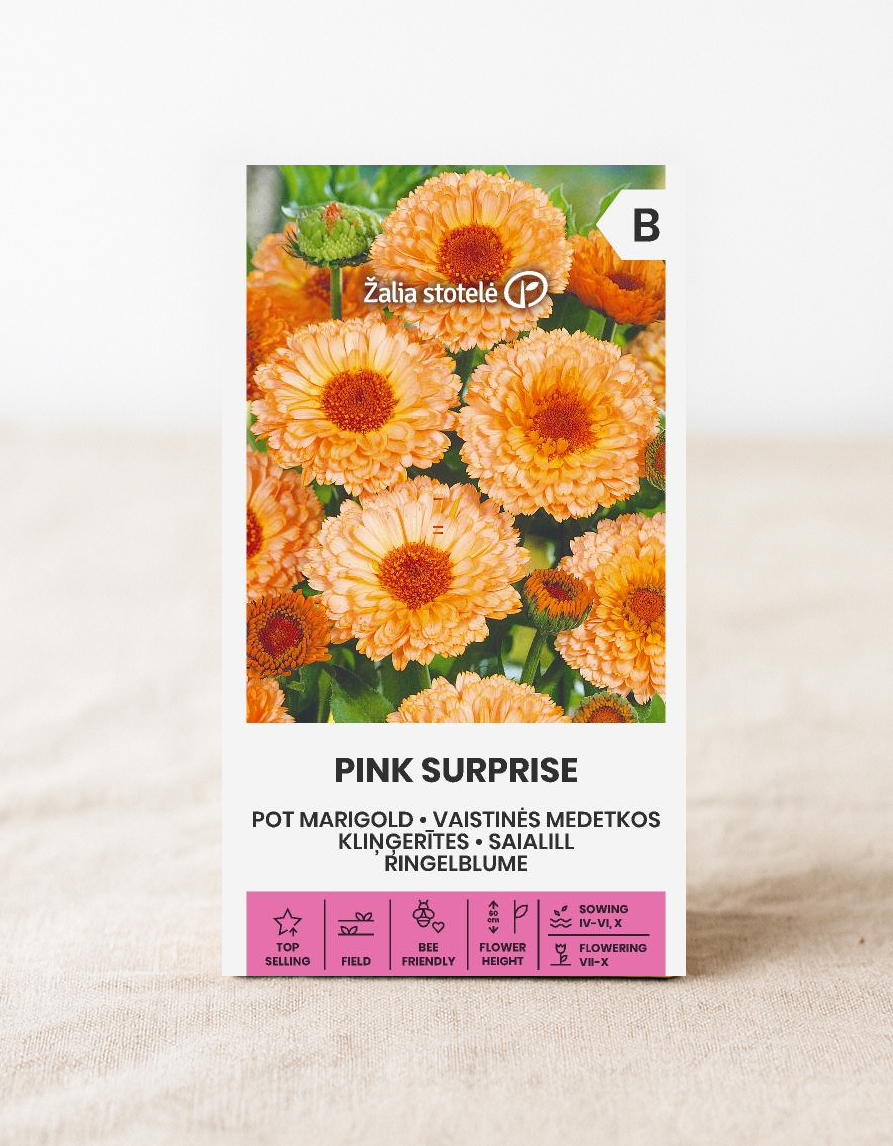 Saialillan siemenet "Pink Surprise" ovat helppokasvuisia ja runsaasti kukkivia yksivuotisia kesäkukkia, joiden korkeus voi olla jopa 60 cm. Vaikka lajikkeen nimi viittaa vaaleanpunaiseen, kukat ovat kirkkaan oransseja, joissa on ajoittain vaaleanpunaisia sävyjä - todellinen katseenvangitsija reunustuksessa ja ruukussa.