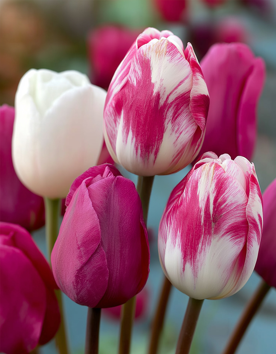 Vaaleanpunaisten tulppaanien sekoitus tuo kevätistutuksiin pehmeän, romanttisen ja raikkaan ilmeen. Tässä kauniissa sekoituksessa yhdistyvät eri sävyiset vaaleanpunaiset ja valkoiset tulppaanit, mukana sekä yksivärisiä hennon vaaleanpunaisia kukkia että näyttävämpiä vaaleanpunavalkoisia kirjavia lajikkeita. Yhdessä ne luovat iloisen, naisellisen ja elegantin kokonaisuuden, joka sopii erinomaisesti niin klassiseen kuin romanttisempaankin puutarhaan.
