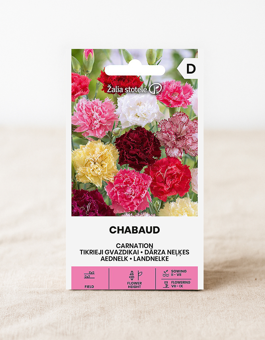 Chabaud‘ on tuoksuva kesäkukka, jolla on kauniit 4-7 cm:n kukat ja joka sopii hyvin reunustukseen tai leikkokukaksi. Kylvö aikaisin keväällä tuottaa kukkia kesän alkupuoliskolla, kun taas kylvö keskikesällä tuottaa kukkia loppukesällä ja alkusyksyllä. Voidaan kasvattaa yksivuotisena, mutta toimii talvella myös kaksivuotisena.