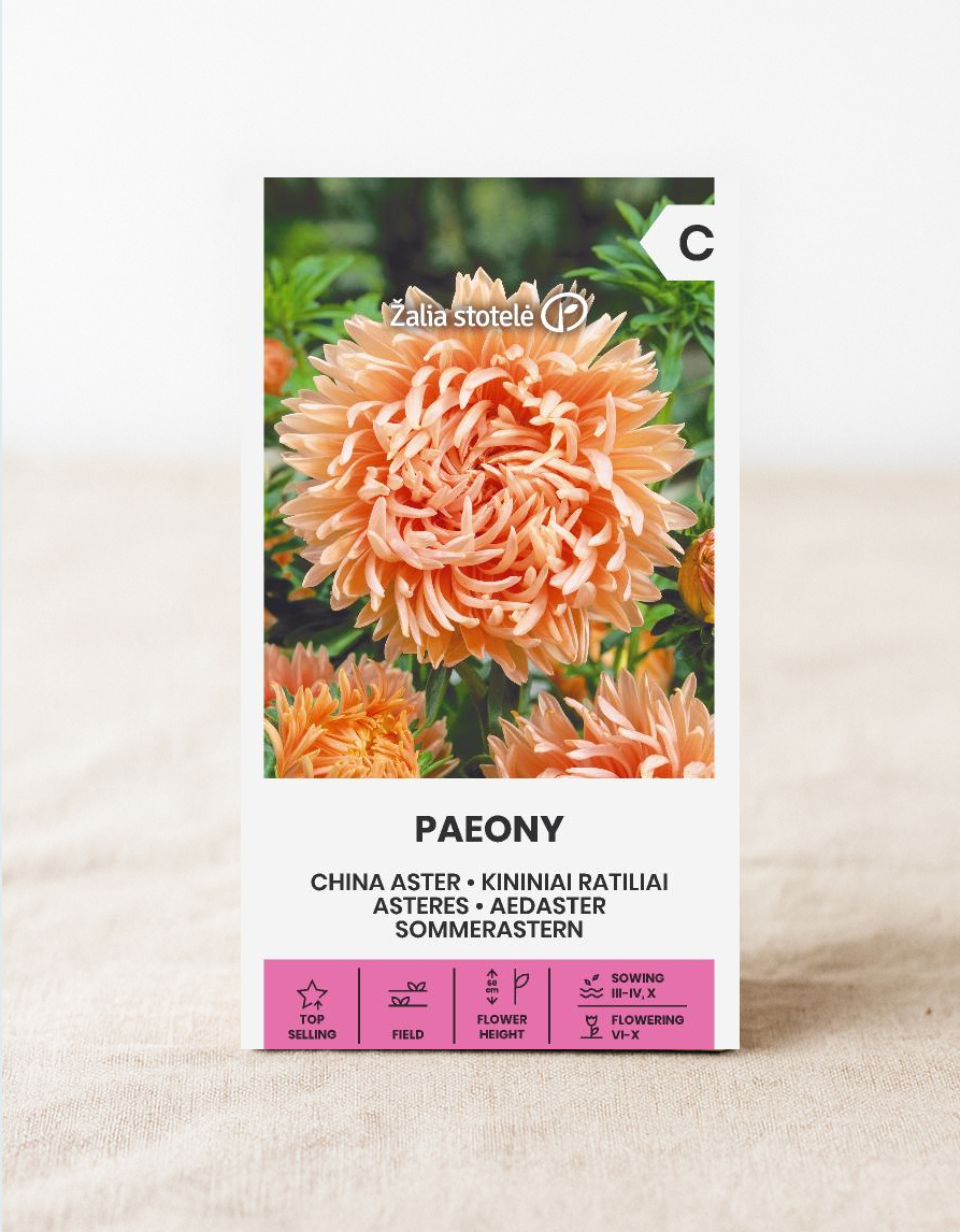 ‘Paeony’ lõheroosa china aedaster on yksivuotinen kesäkukka, jolla on näyttäviä suuria kukkia, joka kasvaa noin 60 cm korkeaksi ja muodostaa hyvin haaroittuneen kasvin. Kukat ovat reheviä, täyteläisiä ja kauniin limenvaaleanpunaisen sävyisiä, joten se sopii erinomaisesti kukkapenkkiin tai leikkokukaksi.
