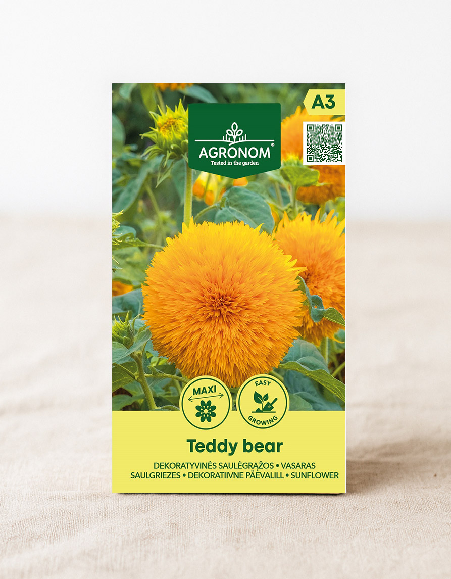 Auringonkukka ‘Teddy Bear’ on alempi auringonkukka-lajike, jolla on erityisen kaunis ja pörröinen kukka, joka luo puutarhaan todellisen “auringonpallo”-efektin. Kasvi kasvaa 50-60 cm korkeaksi, ja se sopii erinomaisesti rajauksiin, reunuksiin ja myös isompiin ruukkuihin terassille tai parvekkeelle. Suuret, tiheästi kaksinkertaiset keltaiset kukat (jopa 15 cm) ovat pitkäikäisiä ja sopivat myös leikkokukiksi ja kukkakimppuihin.
