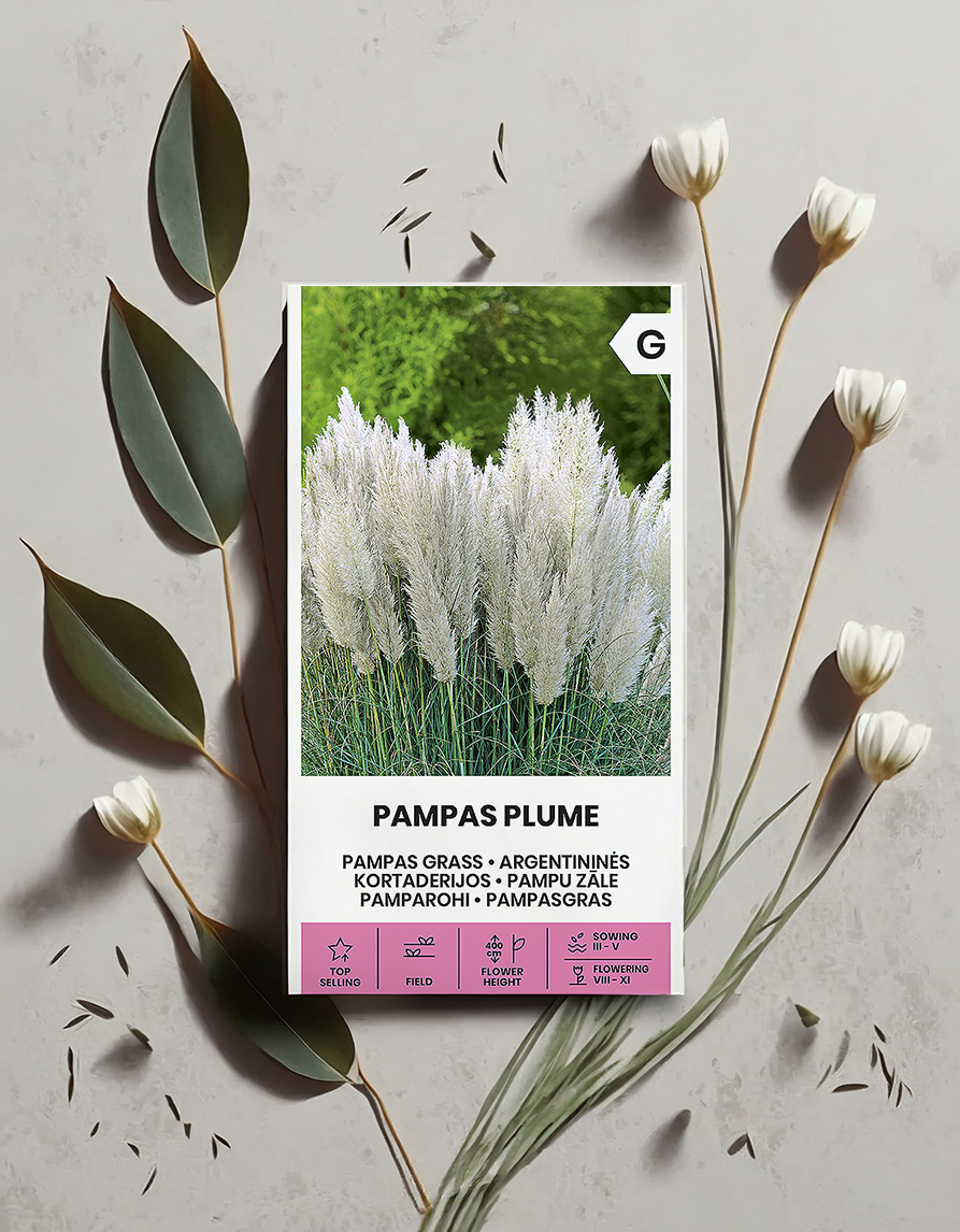 Monivuotinen ja vaikuttavan korkea koristekasvi, joka tuo puutarhaan kauniita ja ylellisiä kukkia. Pampasruoho voi suotuisissa kasvuolosuhteissa nousta jopa 4 metrin korkeuteen, mikä tekee siitä ihanteellisen kasvin kukkapenkkiin, puutarhan koristeeksi ja puutarhakoristeeksi. Kasvi tuottaa 30-40 cm:n pituisia valkoisia kukkia, jotka ovat näyttäviä ja koristavat puutarhaa myöhäissyksyyn asti. Pampas Plume säilyttää koristeellisuutensa läpi vuoden.