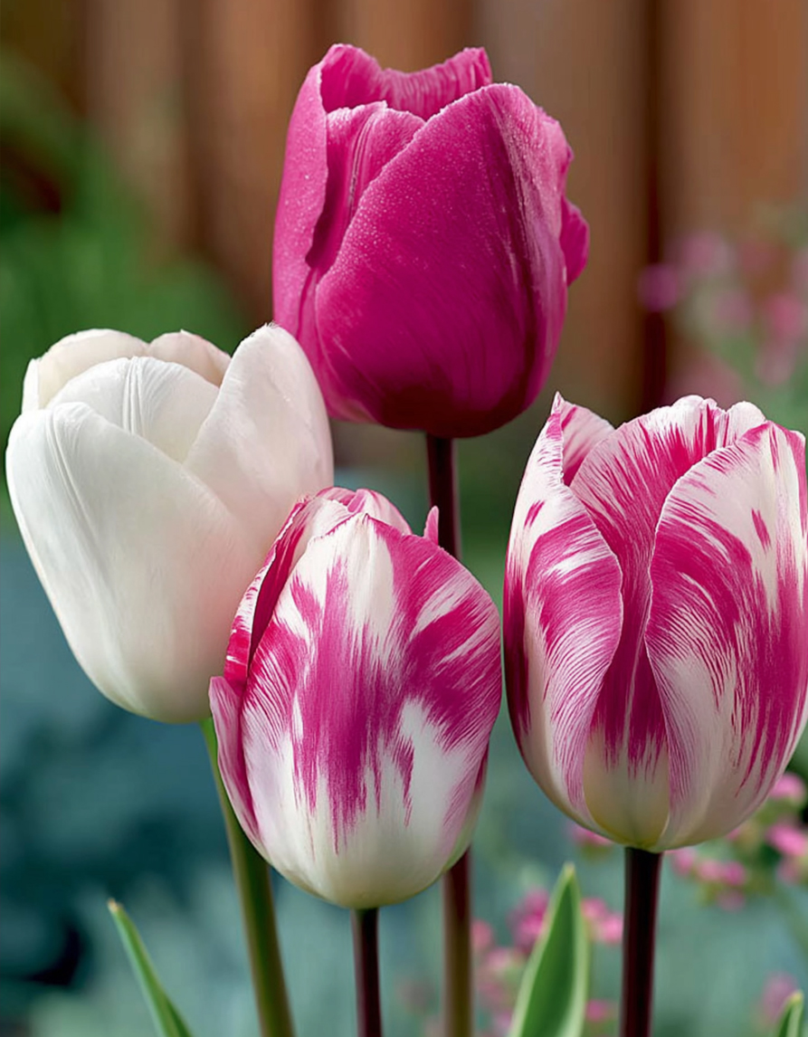 Vaaleanpunaisten tulppaanien sekoitus tuo kevätistutuksiin pehmeän, romanttisen ja raikkaan ilmeen. Tässä kauniissa sekoituksessa yhdistyvät eri sävyiset vaaleanpunaiset ja valkoiset tulppaanit, mukana sekä yksivärisiä hennon vaaleanpunaisia kukkia että näyttävämpiä vaaleanpunavalkoisia kirjavia lajikkeita. Yhdessä ne luovat iloisen, naisellisen ja elegantin kokonaisuuden, joka sopii erinomaisesti niin klassiseen kuin romanttisempaankin puutarhaan.